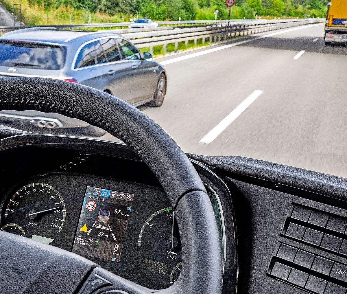 4. Safety Coach Travego: mit Notbremsassistent mit Vollbremsung, vorausschauender Tempomat PPC mit Reaktion auf Topografie.