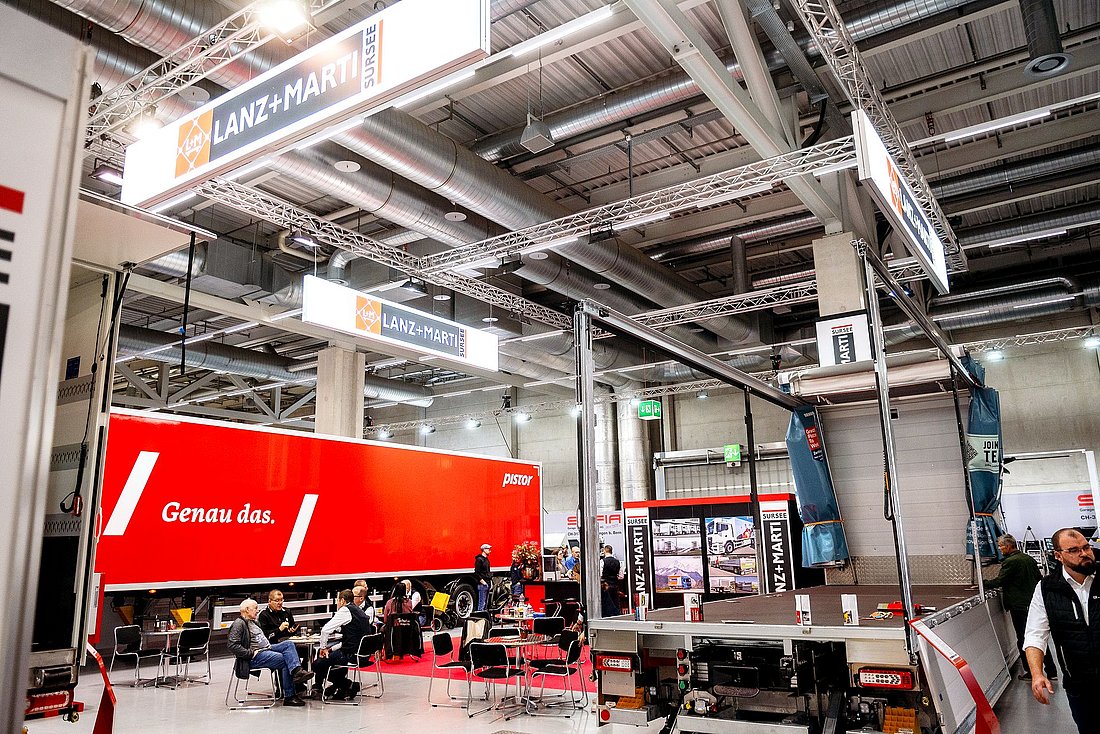 Der Schweizer Fahrzeugbauer Lanz+Marti hat in Bern mit dem Doppelgelenkscharnier «Skorpion» eine neue patentierte Entwicklung präsentiert. Es konnte am Stand besichtigt und getestet werden. Das zwangsgesteuerte Doppelgelenkscharnier ermöglicht das vollständige Abklappen der seitlichen Bordwand um 180 Grad, ohne dabei die Reifen oder die Kotflügel zu beschädigen. Dies funktioniert sogar bei Fahrzeugen mit überstehenden Unterfahrschützen. Grund für diese Eigenschaft ist ein zweiphasiger Schwenkmechanismus. Die Bewegung erfolgt demnach in zwei Schritten, was laut Lanz+Marti eine präzise Steuerung ermöglicht. Erst wenn der Seitenladen eine Neigung von rund 90 Grad erreicht hat, wird die zweite Achse aktiviert, was für den kollisionsfreien und kontrollierten Öffnungsvorgang sorgt. Am Stand war auch ein Mercedes-Benz eActros 400 zu sehen, der von Lanz+Marti im Auftrag von Daimler Truck aufgebaut wurde, sowie ein Sattelauflieger mit einem bedienbaren Rolltor für die Pistor AG.