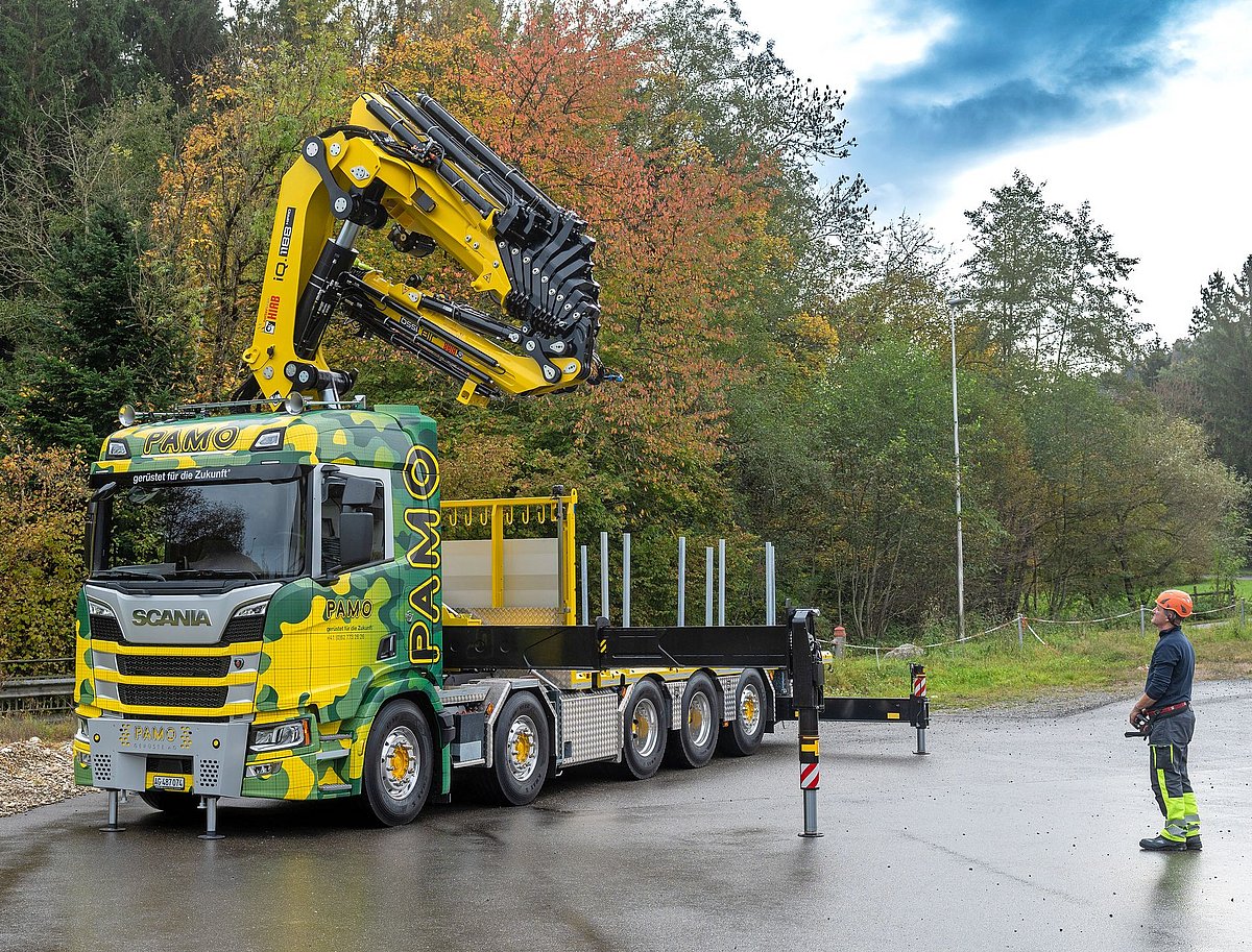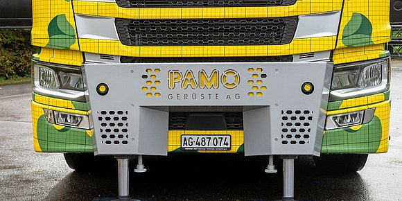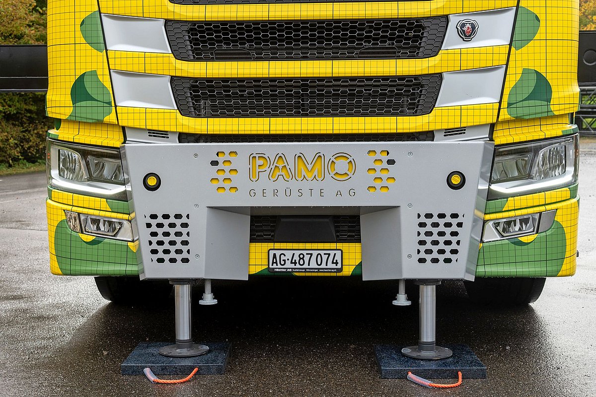Der neue Scania in den markanten Farben des Gerüstbauunternehmens PAMO ist erst seit Kurzem zum Fuhrpark der Aargauer Firma gestossen. So richtig zum Einsatz kommen wird er wohl erst nach der transport.ch in Bern, wo das Kranfahrzeug am Stand von Notterkran zu sehen sein wird. Der bekannte Anbieter von Kran- und Hakengeräteaufbauten hat den Scania aufgebaut. Dennoch hat PAMO-Chauffeur Sadik Berisha schon die ersten Erfahrungen machen können. «Die Steuerung des Kranfahrzeugs ist gleich wie beim Vorgänger, sie hat einfach noch mehr Funktionen», sagt er. Auf jeden Fall freue er sich bereits auf die ersten grossen Einsätze mit dem neuen Kranfahrzeug.