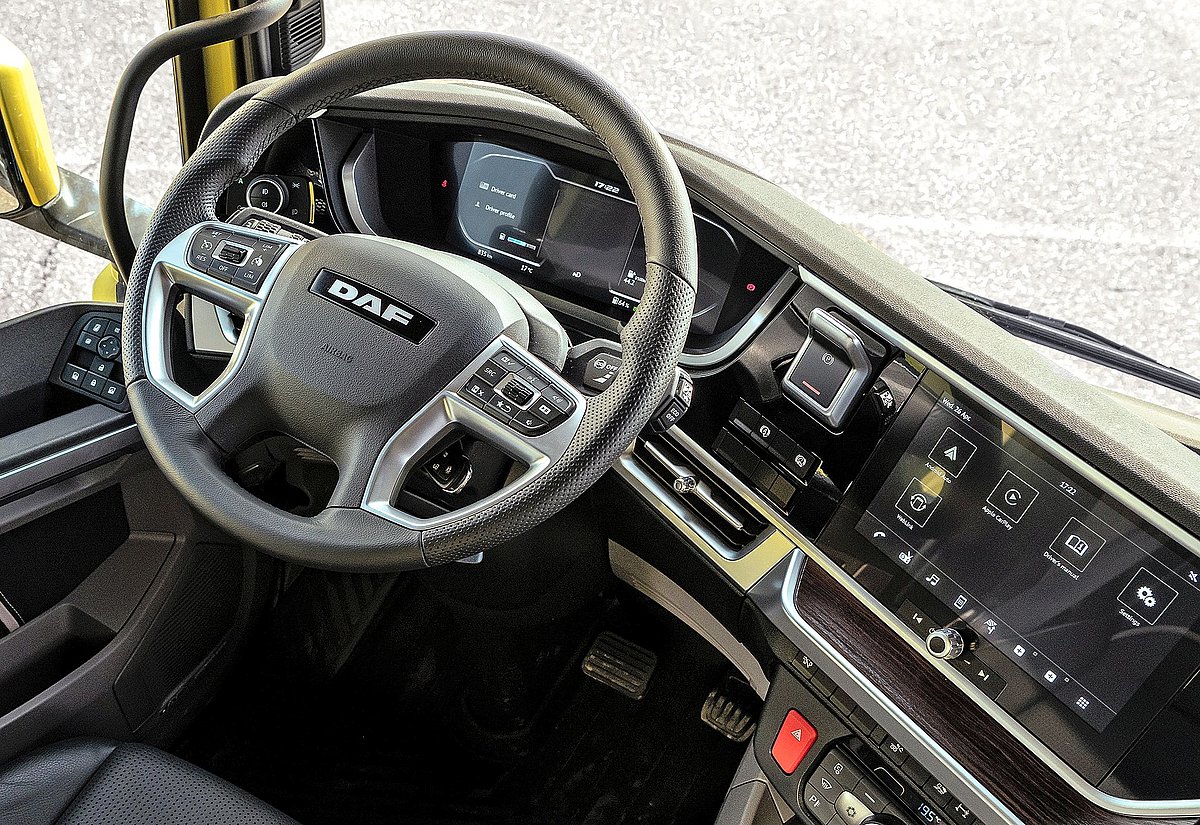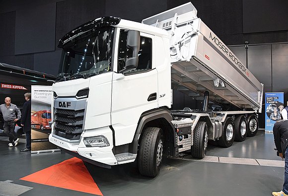 Das neue 10×4-Fahrgestell kann nicht nur für einen DAF mit XD-Kabine bestellt werden, es ist auch als XF-Variante verfügbar, wie es an der transport.CH in Bern zu sehen war. Beide Varianten bieten eine sehr gute Übersichtlichkeit, denn beide Fahrerhäuser wurden mit diesem Fokus konstruiert. So verbessern grossflächige, tiefgezogene Fenster, ein geschwungenes Armaturenbrett und das optional erhältliche Bordsteinfenster die direkte Sicht auf die Zonen im Nahbereich. Ergänzt wird dies durch moderne Kamerasysteme, die DAF anbietet: Das DAF Digital Vision System ersetzt die herkömmlichen Spiegel und erweitert das Sichtfeld, während DAF Corner View und die Rückfahrkamera auch wichtige Indirektsichten bieten – ein Sicherheitsplus in unübersichtlichen Baustellensituationen.