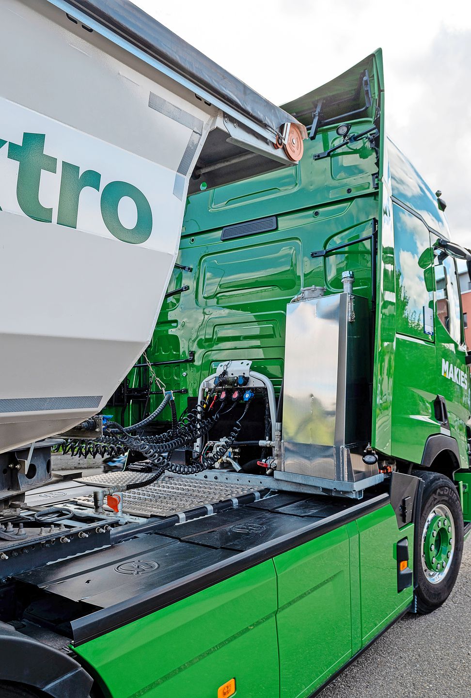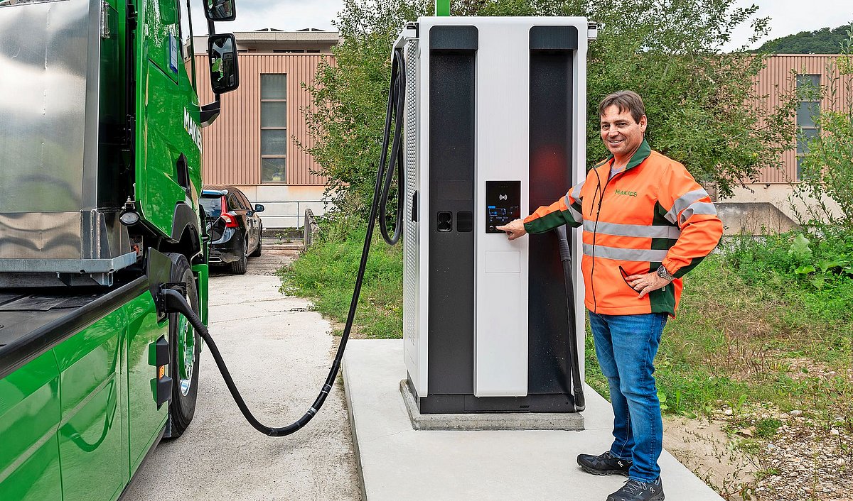 Der Renault Trucks E-Tech T4×2 in den MAKIES-Farben ist eine Sattelzugmaschine mit satten 666 PS. Die Batterieleistung beträgt brutto 540 kWh. «Das reicht nicht immer für den ganzen Tag», sagt Kurt Marti. Schliesslich ist der Schlepper immer mit den für diese Fahrzeuge erlaubten 42 t unterwegs. Deshalb hat MAKIES in seinem Kieswerk im benachbarten Gettnau eine Schnellladestation eingerichtet. «Das Kieswerk bietet dafür gute Voraussetzungen, denn es hat für den Betrieb bereits eine Versorgung mit genügend Strom», sagt Kurt Marti. Zudem habe man dort grosse Photovoltaikanlagen auf den Dächern. Der neue E-Truck kann jeweils über Mittag die Batterien wieder aufladen, sodass es gut über den ganzen Tag reicht. Die Ladestation funktioniere sehr gut, die Steuerung hingegen sei noch verbesserungswürdig. Das Tool, das man gekauft habe, biete noch nicht alle Funktionen, die man sich wünsche. So könne man noch nicht präzise einstellen, wann der Lastwagen am Wochenende geladen werden soll, zum Beispiel in Bezug auf die Verfügbarkeit des eigenen Sonnenstroms. «Das sind wir noch am Ausprobieren», sagt Kurt Marti.