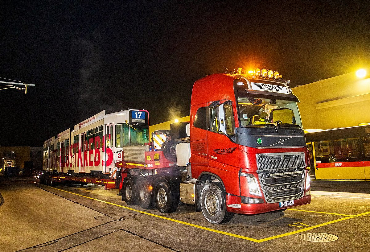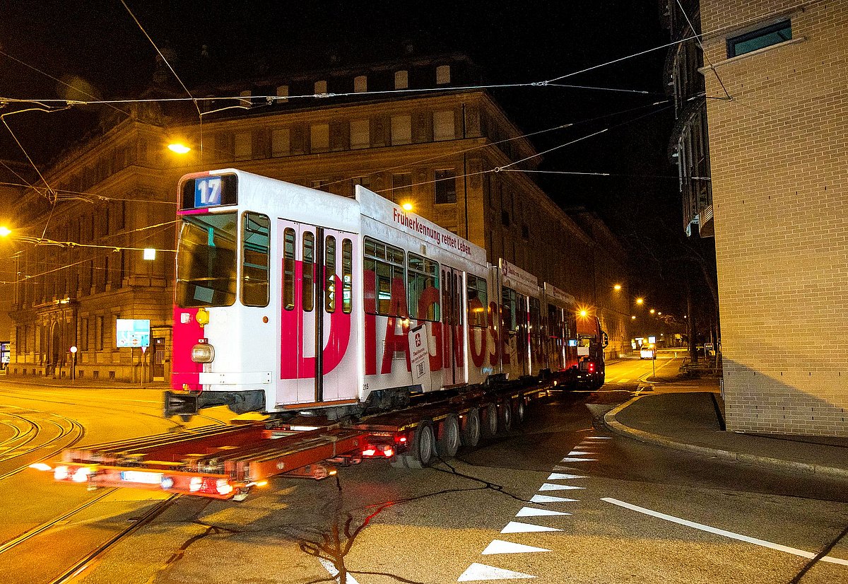 Die beiden Tramtransporte waren jeweils 34 m lang und 3 m breit, mit ihrer Ladung haben sie eine Gesamthöhe von 4,45 m. Da in Basel wie in anderen Städten die Tramschienen als Schwerlastspuren verwendet werden, fahren die Tieflader erst gegen 24 Uhr los. So erreichen sie das Stadtgebiet erst, nachdem das letzte Tram gefahren ist und haben keinen Kreuzungsverkehr zu befürchten.