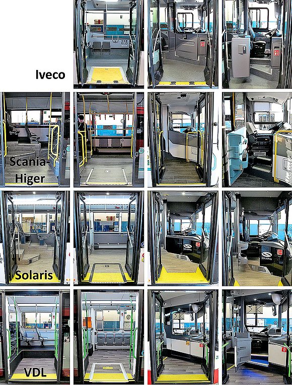 Ein besonderer Fokus liegt bei jenen Aspekten, die die Chauffeuse und den Chauffeur betreffen, namentlich das Fahrverhalten, die Verkehrsübersicht und die Bedienung des Fahrerplatzes. Zur Gestaltung des Arbeitsplatzes zählt auch der Zugang, der auf dem Foto unten die unterschiedlichen Ansätze zeigt. Beim Fahrverhalten geht es um die zuverlässige Funktion der Assistenzsysteme, aber auch um das Lenkverhalten und das Ansprechen des Antriebes, welche das Fahrverhalten in engen Kurven oder beim Anfahren definieren.