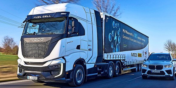 Wie bei seinen Fahrzeugen beschränkt sich der Hersteller aus München nicht auf eine einzige Alternativantriebstechnologie. So verkauft BMW zwar in grossen Stückzahlen Elektromobile, entwickelt aber auch auf der Schiene von Wasserstoff-Brennstoffzelle weiter. Und in der Logistik gelangen seit vergangenem Jahr erste batterieelektrische Lastwagen von DAF zum Einsatz, doch kamen vor Kurzem zwei Brennstoffzellen-Trucks von Iveco dazu, welche bis zu 800 km Reichweite aufweisen und daher die längeren Zulieferstrecken abdecken können. Die Iveco werden zwischen Nürnberg und Leipzig eingesetzt, wobei an beiden Orten je eine Wasserstoff-Tankstelle neu erbaut wurde. Wasserstoff spielt übrigens auch in der Fertigungslogistik von BMW eine zunehmend wichtige Rolle (vgl. Kasten).