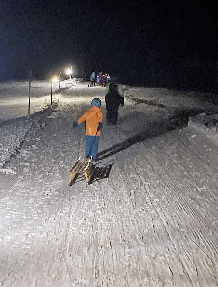 In Sparenmoos angekommen, wurden voller Vorfreude die Schlitten gefasst. Nach einem kleinen Fussmarsch wurde die erste Runde bis zur Haltestelle Heimchueweid geschlittelt um nochmals nach Sparenmoos zu gelangen. Anschliessend genoss die Gesellschaft ein feines Site-Alp Fondue und liess den Abend gemütlich in der Beiz ausklingen.